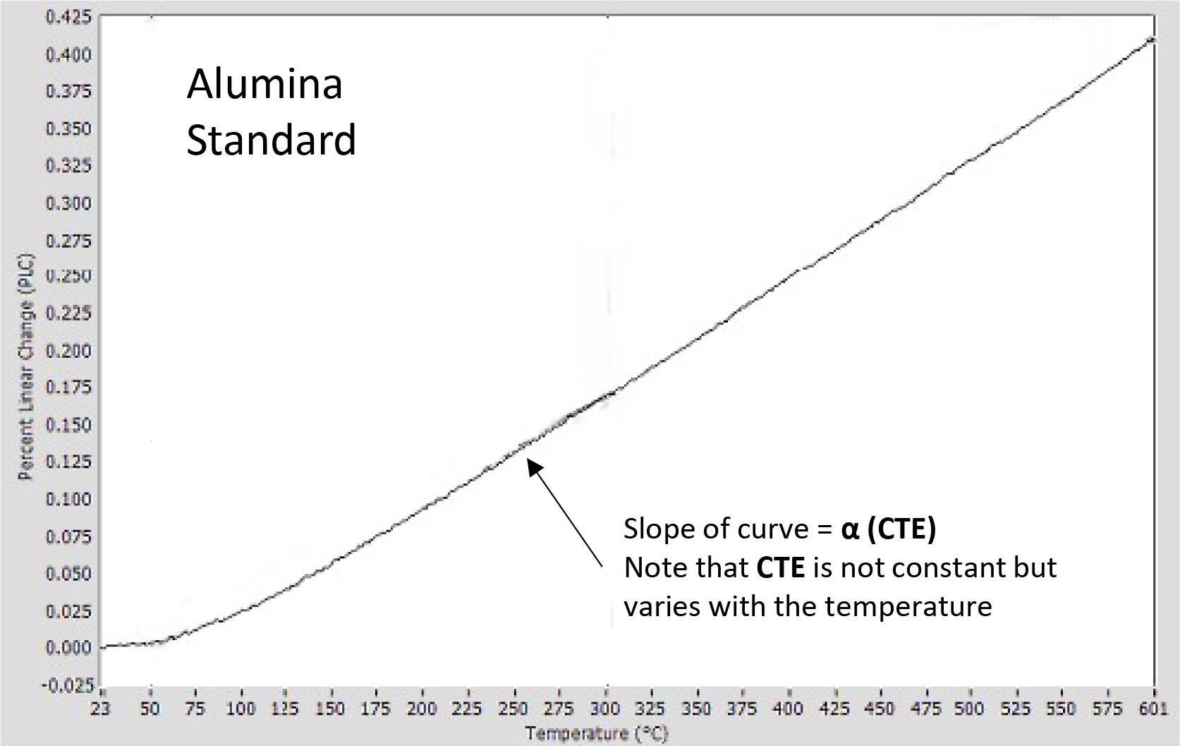 A thermal expansion curve for an alumina standard, shown in Figure 3, plots the sample length versus temperature. In this format, the vertical axis is the Percent Linear Change (PLC) while the horizontal axis displays the temperature. Traditionally, the CTE is represented by the Greek symbol α, and is the derivative or slope of this curve, expressed mathematically as: