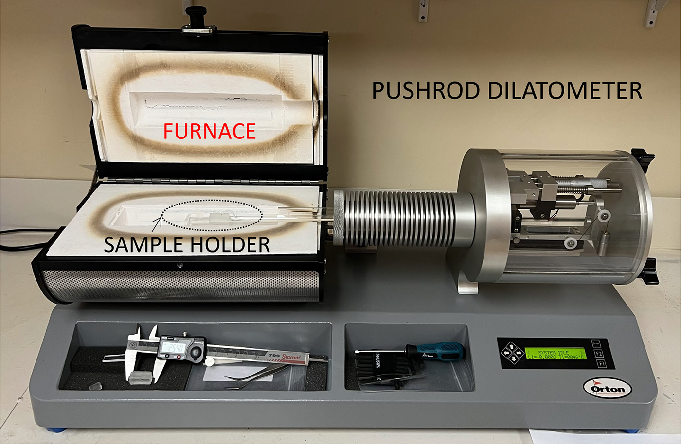Fusion Ceramics has a Dilatometer Model DIL 1410STD manufactured by the Edward Orton Jr. Ceramic Foundation. Pictured in Figure 1, this instrument can reach temperatures of 1000°C and enables precise measurement of CTE for ceramic and glass samples. Proper sample preparation is required to ensure accurate and repeatable measurement, and this step usually involves cutting a small bar of the sample material ( e.g., ¼” x ¼” cross-section) to a standard length (1 cm, 1”, or 2” long) and then grinding or polishing the end faces so they are parallel.