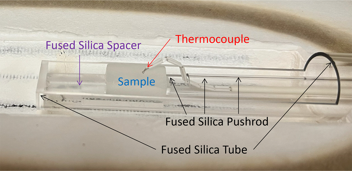 Figure 2 provides a close-up of the sample and sample holder assembly, which is composed of fused silica. A thermocouple passing through the pushrod tube is in contact with the sample to obtain an accurate temperature reading during the measurement.