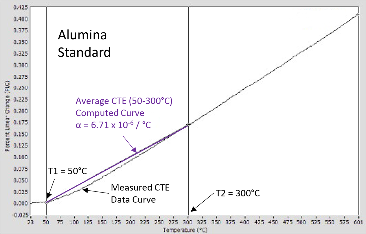 Figure 3 shows the PLC for an aluminum oxide (alumina) standard sample; alumina is used as a standard because it has a relatively constant CTE and is not reactive, even up to high temperatures. As is typical for most materials, the alumina CTE increases with temperature, meaning the slope of the expansion curve is seen to increase slightly with temperature.
