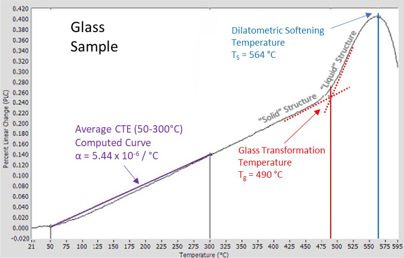 In order to measure the viscosity at even higher temperatures, a different method would be selected; however, the dilatometer provides valuable insight into the glass properties. Many glass applications require the glass to bond with other materials, and often the glass must flow at least a little to make that happen successfully. Furthermore, in some critical applications, the glass must flow sufficiently, but not too much, so that the bonded part does not lose its shape. It is clear that a detailed understanding of the viscosity behavior is necessary, not only for selecting the best candidate glass, but also for developing a safe and effective temperature profile for such a bonding process. By using a pushrod dilatometer to precisely measure the CTE, Tg and Ts for a glass sample, the material scientist can discover a wealth of information about the thermal behavior for that particular glass composition and, in turn, can exploit that knowledge to develop tailored solutions for a range of glass and ceramic applications.